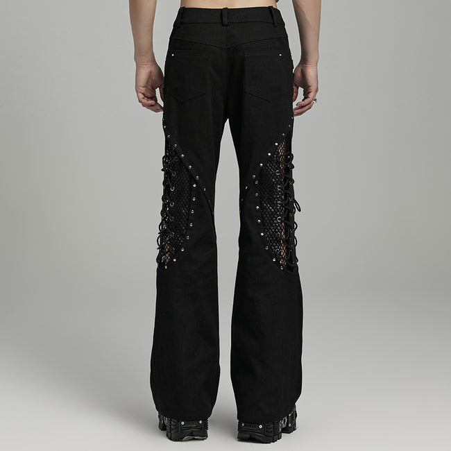 3. Mesh hollowed out drawstring design on both sides of the pants, with flat rivets along the edges, highlighting the segmented silhouette lines of the pants